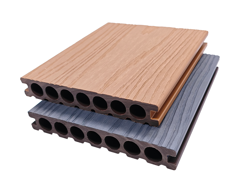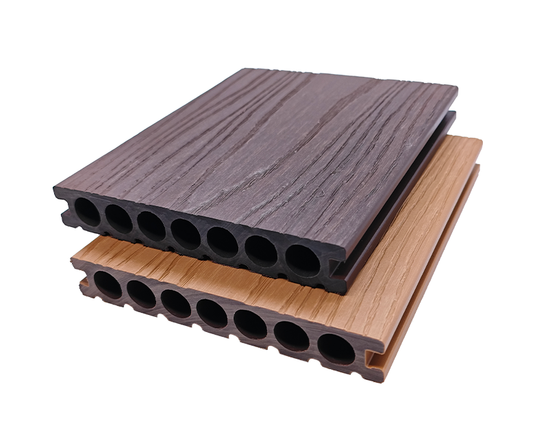 5.窄槽圆孔(直纹)地板,25×140mm 尺寸适配小空间,窄槽排水、圆孔透气,直纹表面统一整洁,家庭庭院小径、阳台休闲区铺装,实用与美观轻松拿捏 。