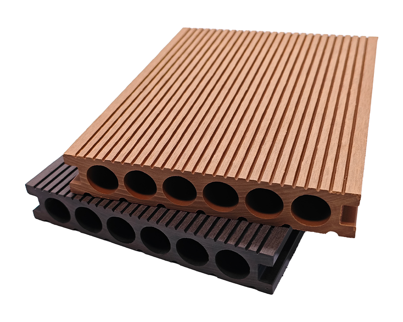 5.窄槽圆孔(直纹)地板,25×140mm 尺寸适配小空间,窄槽排水、圆孔透气,直纹表面统一整洁,家庭庭院小径、阳台休闲区铺装,实用与美观轻松拿捏 。