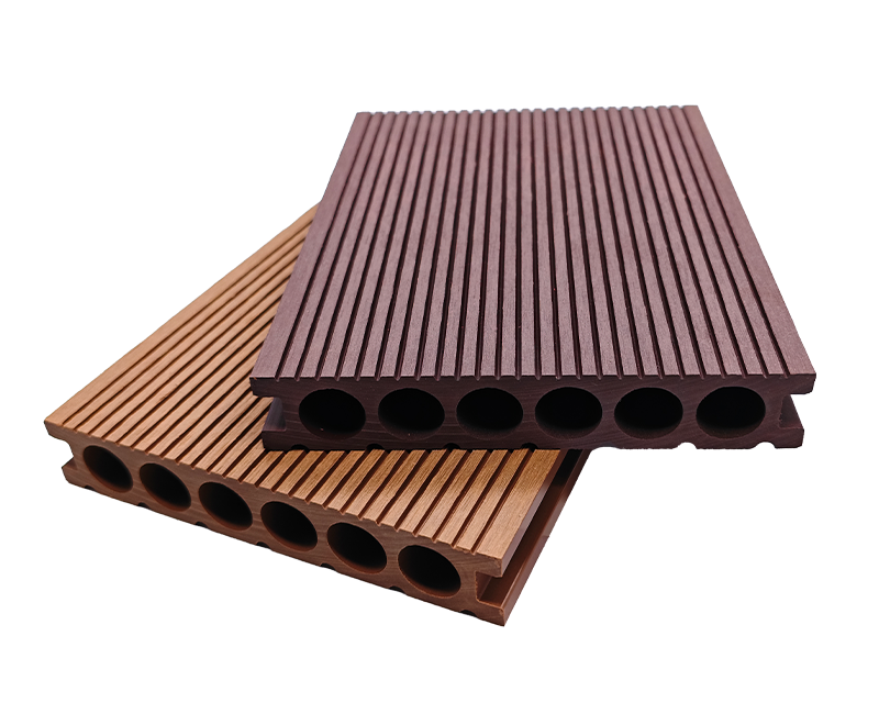 5.窄槽圆孔(直纹)地板,25×140mm 尺寸适配小空间,窄槽排水、圆孔透气,直纹表面统一整洁,家庭庭院小径、阳台休闲区铺装,实用与美观轻松拿捏 。