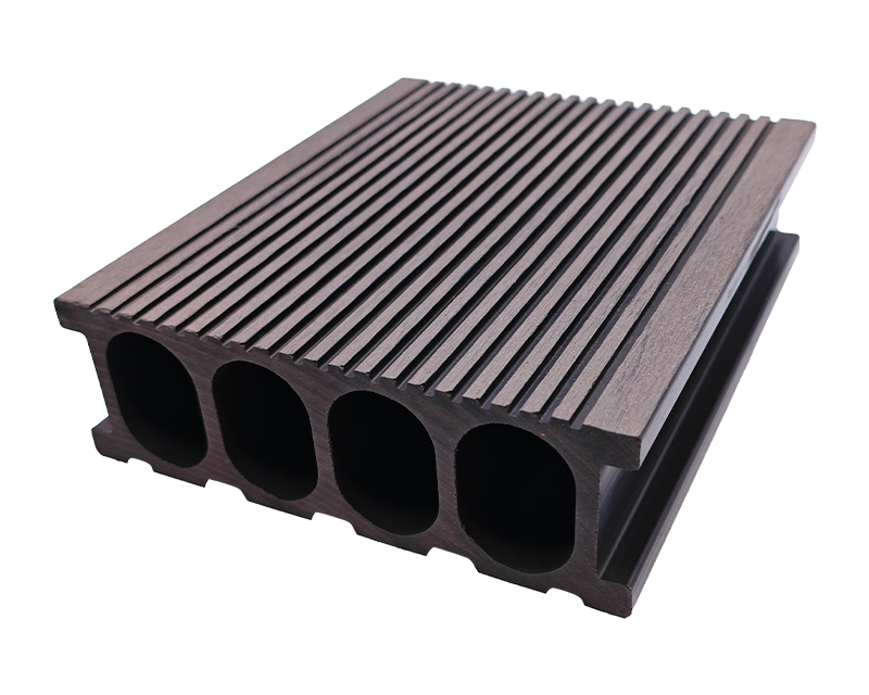 5.窄槽圆孔(直纹)地板,25×140mm 尺寸适配小空间,窄槽排水、圆孔透气,直纹表面统一整洁,家庭庭院小径、阳台休闲区铺装,实用与美观轻松拿捏 。