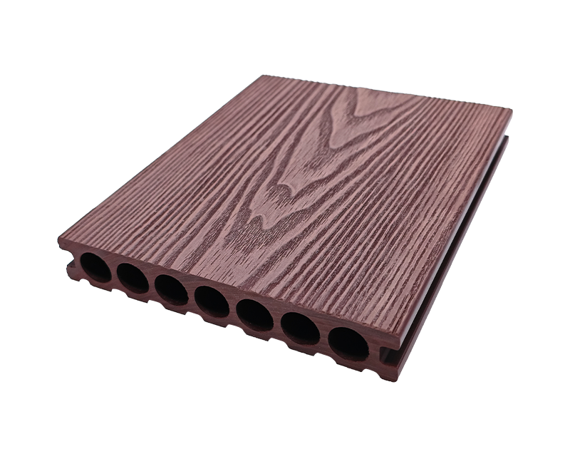 2.以压花工艺为亮点,细槽圆孔地板 25×140mm,细槽排水、圆孔减重,压花图案丰富地面视觉,花园艺术步道、民宿户外展区铺装,用设计点亮空间 。