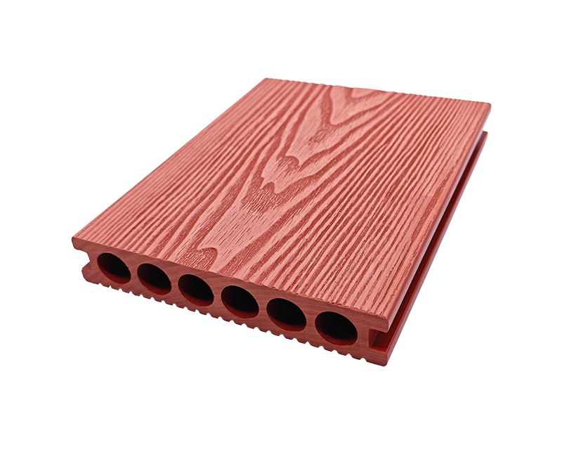 2.以压花工艺为亮点,细槽圆孔地板 25×140mm,细槽排水、圆孔减重,压花图案丰富地面视觉,花园艺术步道、民宿户外展区铺装,用设计点亮空间 。