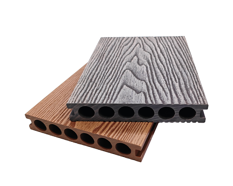 2.以压花工艺为亮点,细槽圆孔地板 25×140mm,细槽排水、圆孔减重,压花图案丰富地面视觉,花园艺术步道、民宿户外展区铺装,用设计点亮空间 。