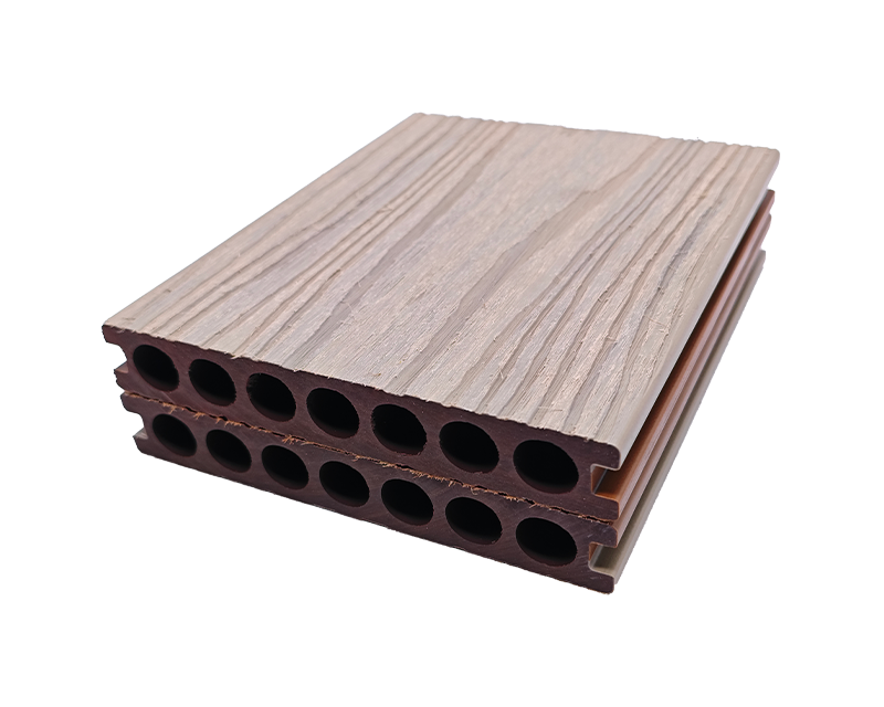 2.双面共挤优势显著,23×150mm 地板两面皆有木纹 / 拉丝效果,户外大面积铺装时,无需区分正反,省时省力,庭院、商业步道铺装,实用与美观双在线 。